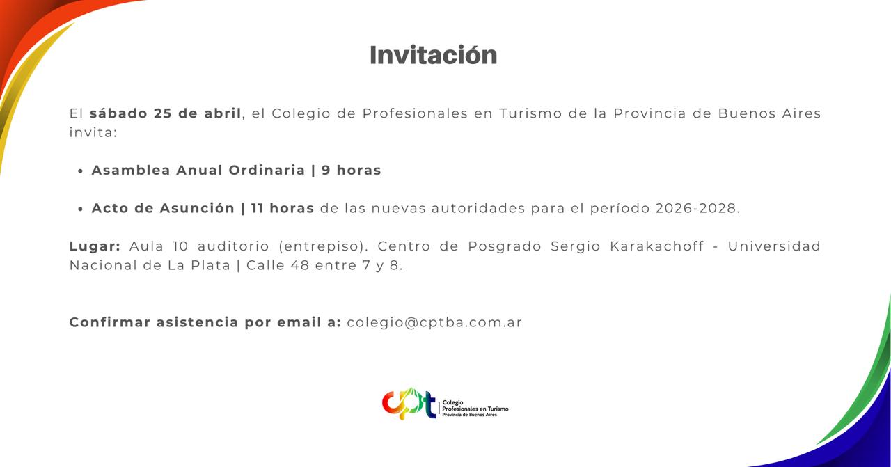El Colegio de Profesionales en Turismo de la Provincia de Buenos Aires invita a participar de su Asamblea Anual Ordinaria y del Acto de Asunción de nuevas autoridades, que se llevarán a cabo el próximo sábado 25 de abril en la ciudad de La Plata.
