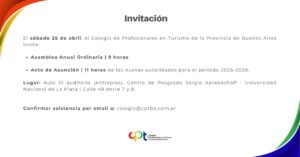 El Colegio de Profesionales en Turismo de la Provincia de Buenos Aires (CPT) llevó adelante su Asamblea Anual Ordinaria el sábado 25 de abril, en el Aula 10 (auditorio, entrepiso) del Centro de Posgrado Sergio Karakachoff de la Universidad Nacional de La Plata.